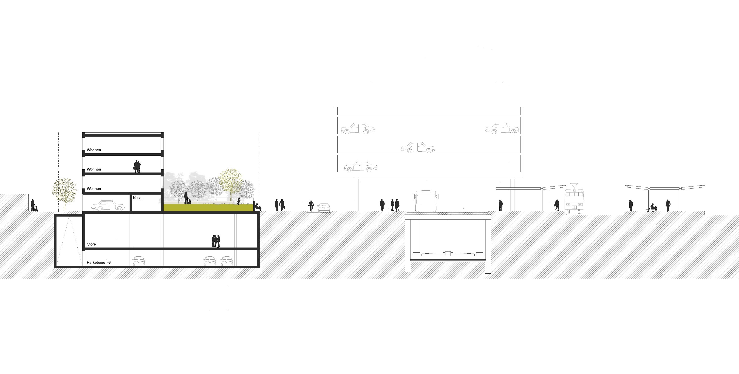 En créant un nouveau corps urbain, les élargissements permettent un large spectre d'utilisation. Le piéton est guidé intuitivement à travers le quartier. Nous créons ainsi des espaces qui lient le contexte urbain au lieu de s'en détacher. Ce faisant, l'espace urbain "espace de pierre" le long et autour de la « Baurestuff » est relié à la « place verte ». La découverte de cette place est donnée grâce à une différence de hauteur marquée.